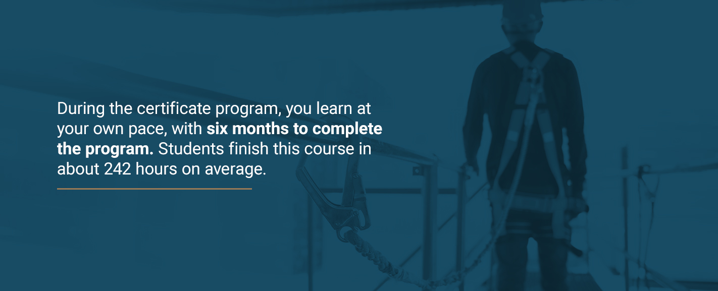 During the certificate program, you learn at your own pace, and you have six months to complete the online courses. Students finish this course in about 242 hours on average and will receive 24.2 CEUs that can be transferred to academic credits through our Partners at Columbia Southern University. To pass, you must earn at least 80% on the final exams at the end of each specialist course. You can attempt each exam twice. While the exams aren’t timed, you must complete each in one session, so be sure to give yourself plenty of time since leaving early will count as a failed attempt. After five to 10 business days, we’ll mail your certificate.