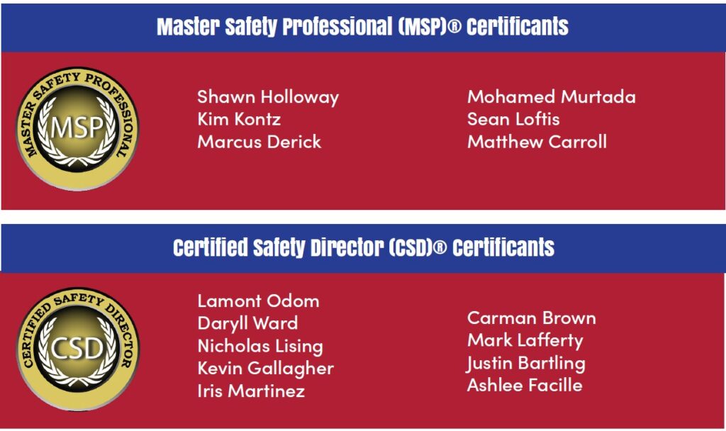 To the newly certified Master Safety Professionals and Certified Safety Directors, we commend you for your outstanding accomplishment and applaud your dedication to advancing the safety field.