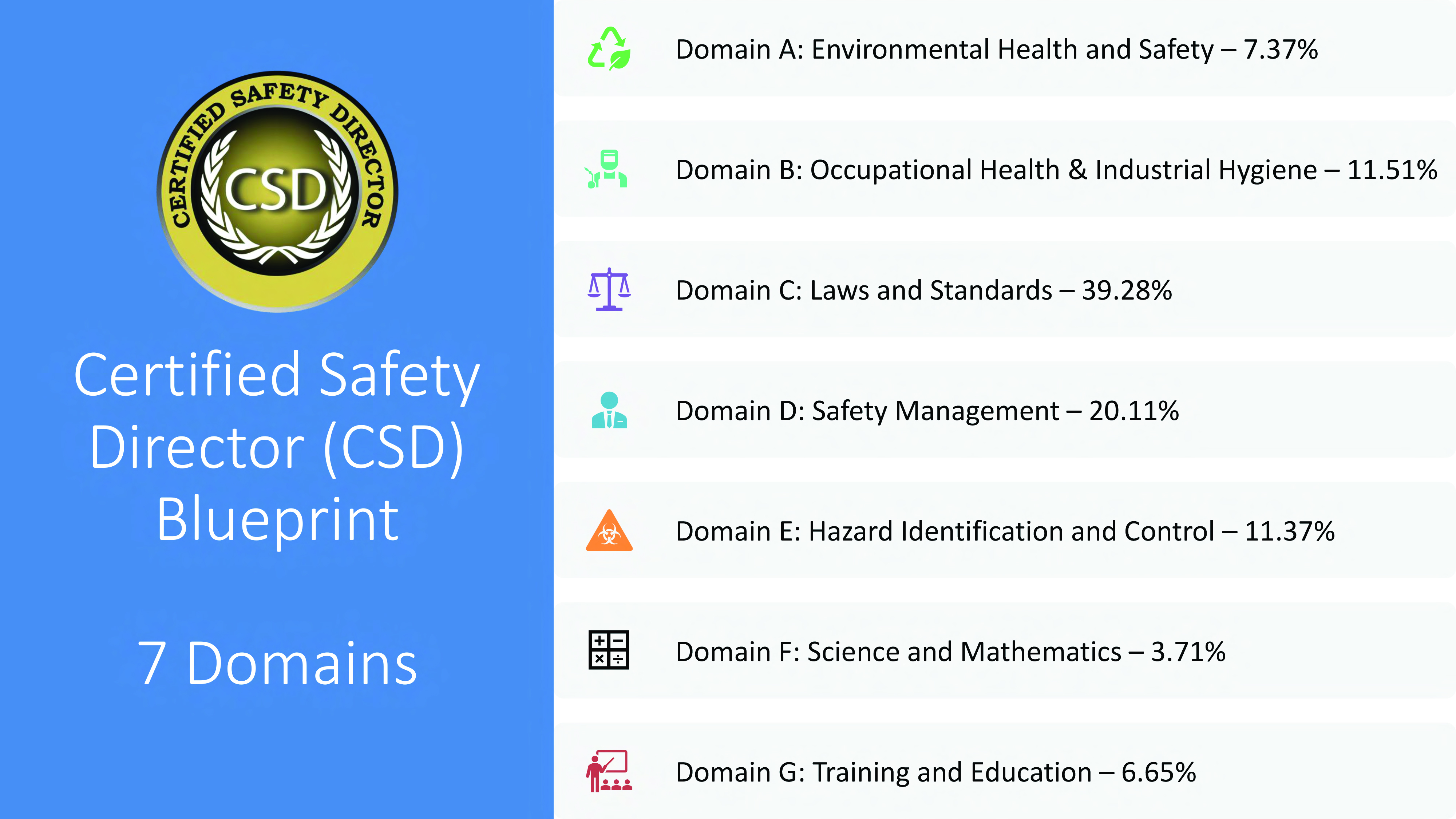 • The MSP and CSD exams focus on practical workplace safety knowledge that you, as a professional, use daily to keep your employees safe. The exams focus primarily on the general industry laws and consensus standards and less on science, mathematics, and engineering.