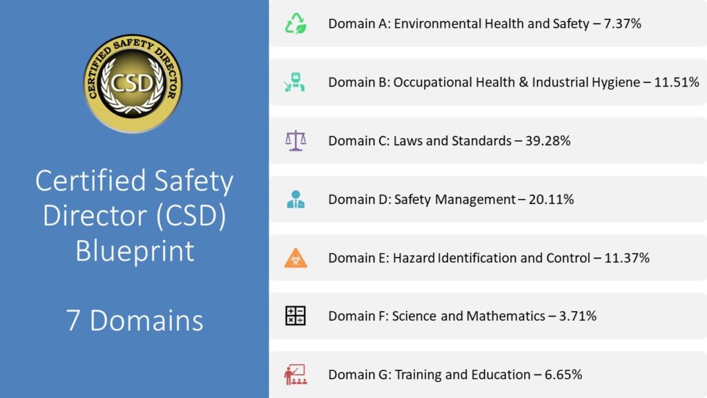 - The MSP and CSD exams focus on practical workplace safety knowledge that you, as a professional, use daily to keep your employees safe. The exams focus primarily on the general industry laws and consensus standards and less on science, mathematics, and engineering.