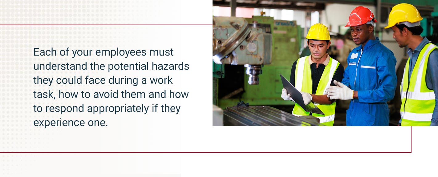 Each of your employees must understand the potential hazards they could face during a work task, how to avoid them and how to respond appropriately if they experience one. Education will significantly help your workers every day on the job.