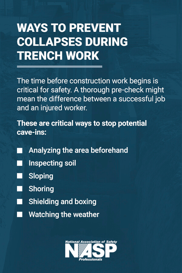 Preventive collapse measures are imperative for worker safety. You can take many precautionary measures to prevent a trench collapse. These precautions occur both before and while completing trench work: